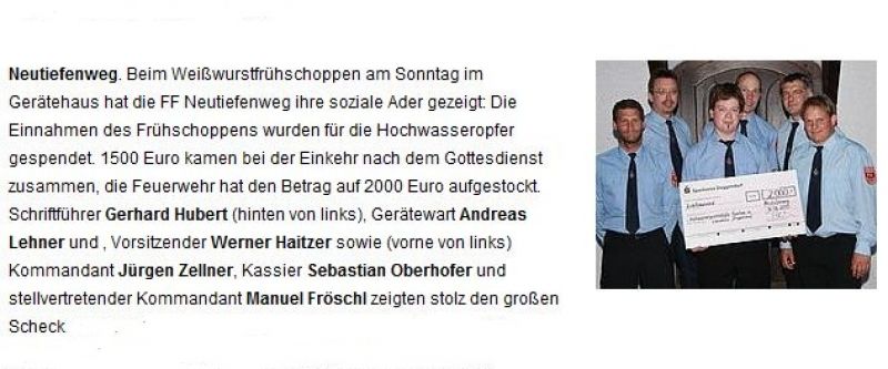 Neutiefenweg: 1926 noch als "Wasserwehr" gegründet, hat die Feuerwehr Neutiefenweg seit dem Ausbau der Isardämme mit Hochwasser kaum noch etwas zu tun. Ihre Aufgabe heute ist neben dem Brandschutz vor allem auf gesellschaftlicher Ebene zu sehen: Das Gerätehaus neben der Kapelle ist für das Dorf eine Art Gemeindezentrum, in dem man sich wöchentlich am Stammtisch trifft und gerne zum Weinfest versammelt.
